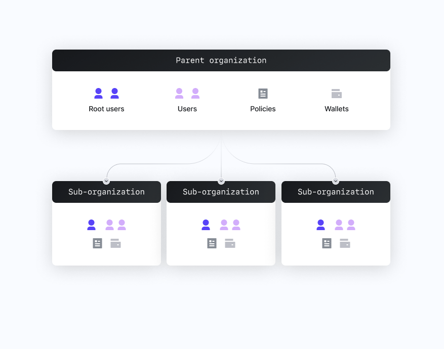 - Authenticators: Each parent org, sub-org and user contain their own sets of authenticators that you can configure, including their own wallets, API keys, and private keys.